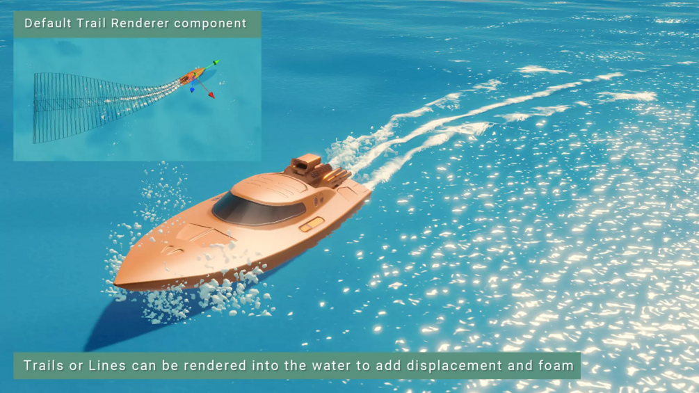 • Unity's Trail Renderer (mainly used for boat wakes) is not without its quircks and hard limitations, this asset is therefore not immune to them. Using Ara Trails is certainly possible. Developing a propiertary trail renderer, for wakes, is under consideration for future development.