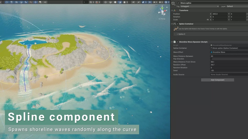 ⢠New shoreline wave spawner component, spawns the shoreline wave prefab along a spline